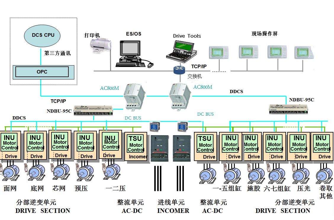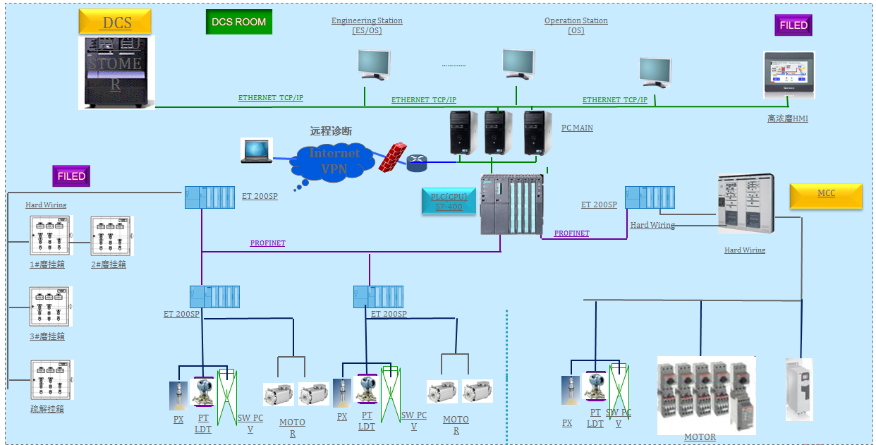 智能MCC是为工业控制应用而设计、制造的,被广泛应用于冶金、造纸、电力、石油、化工等行业。 智能MCC的马达控制集成技术和网络通讯技术为用户带来可靠的马达运行保证和网络控制平台。采用符合工业标准的Profibus、 Device Net等开放网络,连接工厂马达的启动设备,包括软启动、变频器、智能马达保护器、PLC等,从这些设备上获取马达和负载信息,包括电流、电压、过载、转速等,通过网络和系统的DCS、PLC逬行通讯,将马达控制的信息传输到需要到达的地方。由于智能MCC可对马达运行参数进行监控,所以传统的对马达保护延伸到了对整个机械设备的运行状态进行监測和维护。DCS控制系统—流送/热泵/锅炉